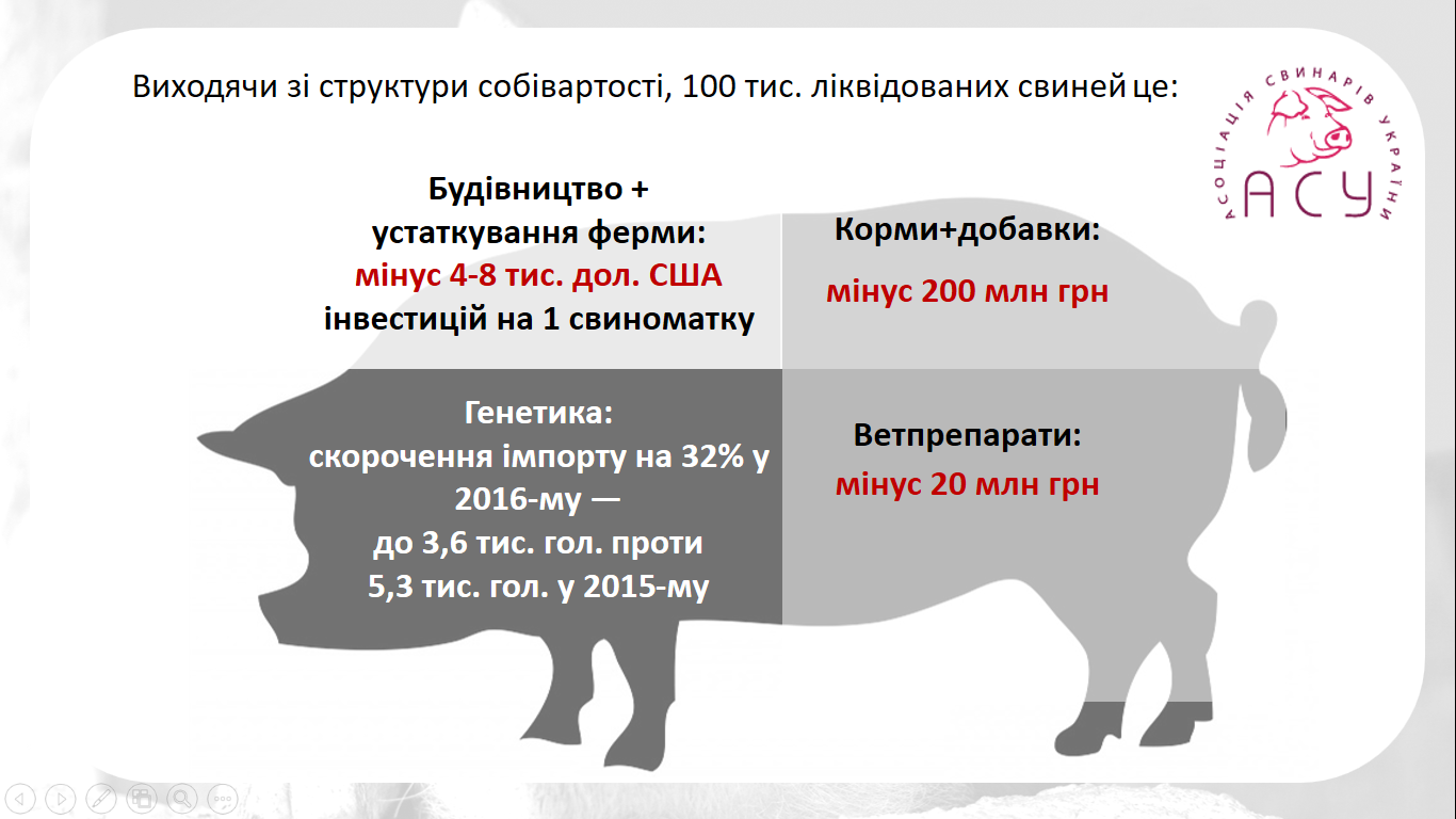 А загалом, якщо будемо говорити про збитки, то лише за 2016-й „африканка“ коштувала Україні в цілому 5 млн доларів», — зазначила віце-президент Асоціації «Свинарі України» Оксана Юрченко.