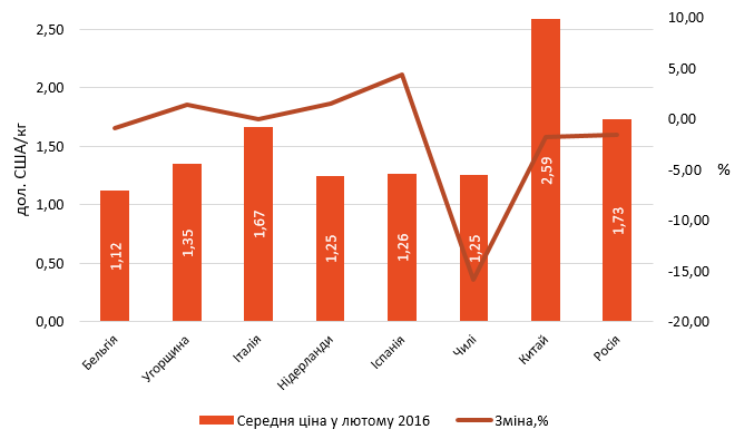 Ціни на туші свиней у деяких країнах світу в жовтні-листопаді 2016 р., дол. США/кг