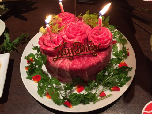 Червоне м’ясо вважається розкішшю в Японії, і останньою новомодною тенденцією став іменинний торт, що складається повністю зі смужок сирого м’яса. На такому торті можна навіть побачити прикраси, також виконані з м’яса. Слід, однак, підкреслити, що м’ясний торт все ж не їдять не в сирому вигляді — його готують на грилі прямо на святковому столі.