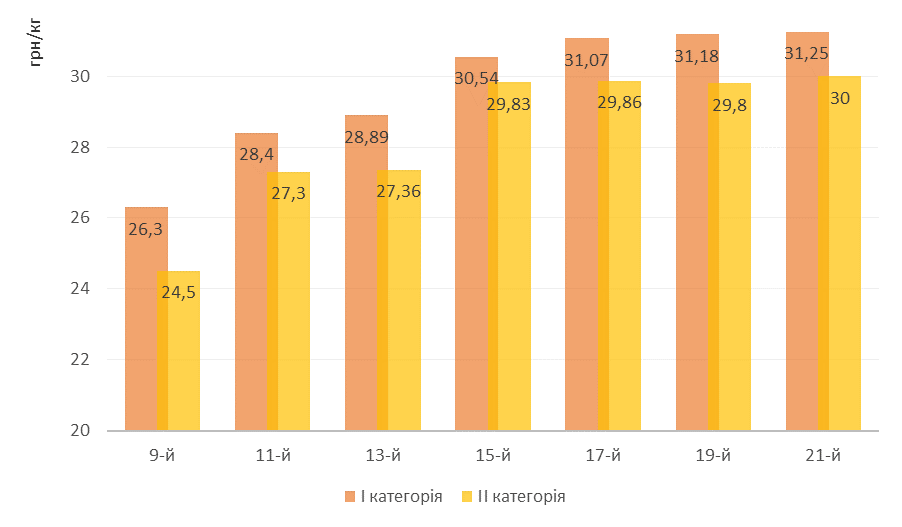 Динаміка закупівельних цін на свиней потижнево, грн/кг