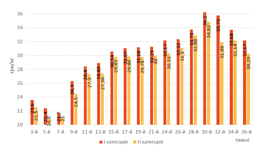 Динаміка закупівельних цін на свиней потижнево, грн/кг
