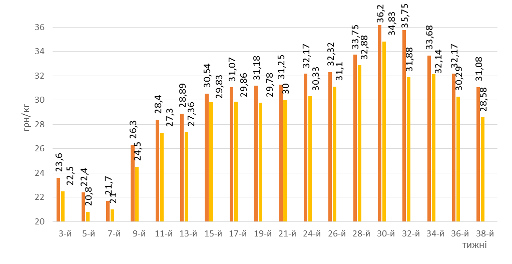У другій половині вересня середня закупівельна ціна на свиней першої категорії продовжує впритул наближатись до психологічної позначки у 30 грн/кг. Нижній поріг цінового діапазону на свиней другої категорії вже перетнула цю межу: кілограм такої свинини на 38-му тижні закупали по 27,5-31,5 грн, проте середній показник в більшій мірі тяжіє до цінового мінімуму. Ціни закупівлі м’ясної свинини варіюють у вужчому коридорі (від 30 до 32,5), тож розрив між середніми цінами на згадані категорії збільшився.