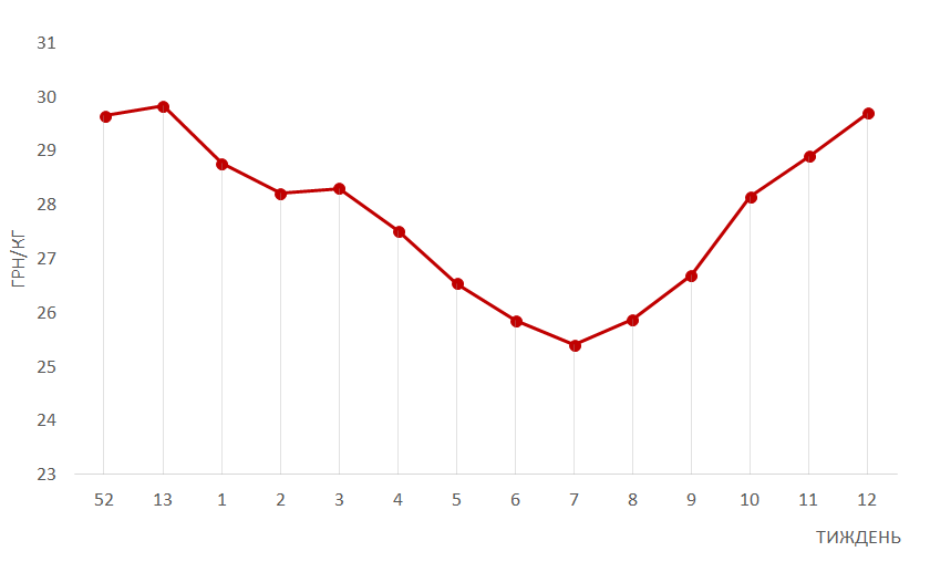 Варто зазначити, що ціна на живець не тільки повністю реабілітувалася, а й повернулася до позначки, досягнутої наприкінці 2015-го. Проте переробники не бачать явних передумов для зростання ціни на товарних свиней. Це позначилося на перебігові п’ятничних торгів: за словами виробників перемовини були напруженішими, важко було втримати ціну на досягнутому рівні. Дехто з виробників мав поступитися, знизивши ціну кілограму свинини живою вагою на 0,2-0,5 грн/кг. Найбільший тиск з боку закупівельників відчувають виробники Західних регіонів, де населення більше дотримується посту, а значить, — зменшує споживання свинини. Не зважаючи на це, діапазон закупівельних цін у кінці березня залишиться на рівні попереднього тижня — 29-30 грн/кг.