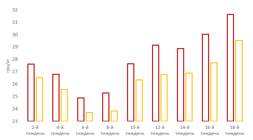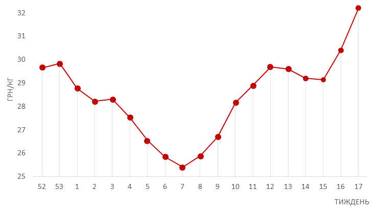 У кінці квітня ціна на живець свиней піднялася в очікуванні хороших продажів. Упродовж передвеликоднього тижня виробники реалізували товарне поголів’я по 31-33 грн/кг, а середня позначка сягнула 32,2 грн/кг. Це на 6% вище ніж у кінці другої декади місяця.