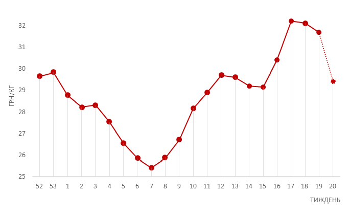 Так і на 20-му тижні виробники західних регіонів очікують найнижчу ціну на живець. Якщо у Центрі очікувані ціни понизилися до рівня 29-30,5 грн/кг, на Сході виробники очікують отримати в середньому по 29 грн/кг живця, то на Заході озвучують планові показники в межах 28,5-29,5 грн/кг.