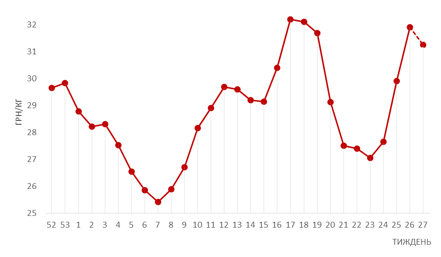 У наслідок цього переробні підприємства закуповують живець І-ї категорії на 27-му тижні в основному по 30-31 грн/кг. «Двійку» купують менше і за значно нижчою ціною — варіює в межах 27-28 грн/кг. Низхідний рух цін переробники пояснюють нижчим попитом та меншими обсягами закупівлі, які скоротилися після минулотижневого «сплеску». Так, більшість відзначає, що попит цьогоріч нижчий, ніж станом на аналогічний період попередніх років. Традиційно сезон овочів та фруктів змушує віддати перевагу цим видам продукції, а приріст попиту в деяких курортних регіонах не компенсував скорочення споживчої активності в містах.