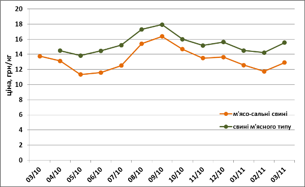 У березні 2011 року спостерігається незначне підвищення ціни на свинину. Якщо середня ціна у лютому 2011 року становила 11,75 грн/кг живої маси м'ясо-сальних свиней та 14,2 грн/кг на свиней м’ясного типу, то в березні 2011 року, ціни піднялись на 9,8% та 9,4% відповідно. Середня ціна на м'ясо-сальних свиней досягла позначки 12,91 грн/кг, а на свиней м’ясного типу — 15,55 грн/кг.