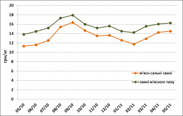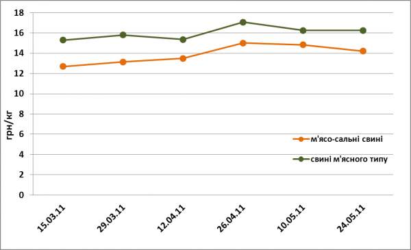 Середньозважені закупівельні ціни на свиней м'ясо-сального типу у травні 2011 року по відношенню до попереднього місяця зросли на 1,9% (0,27 грн/кг) та становили 14,52 грн/кг. Свині м’ясного типу подорожчали на 1,4% (0,23 грн/кг) і відповідно за них пропонували 16,26 грн/кг.