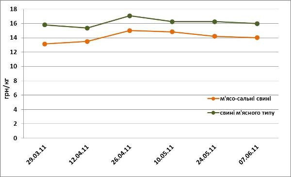 Станом на 7 червня, порівняно із 24 травня, ціни на свиней м'ясного типу знизились на 0,25 грн/кг (1,6%) та становила 16 грн/кг. Закупівельні ціни на свиней м'ясо-сального типу зменшились на 0,20 грн/кг (1,3%) та становили 14,00 грн/кг.