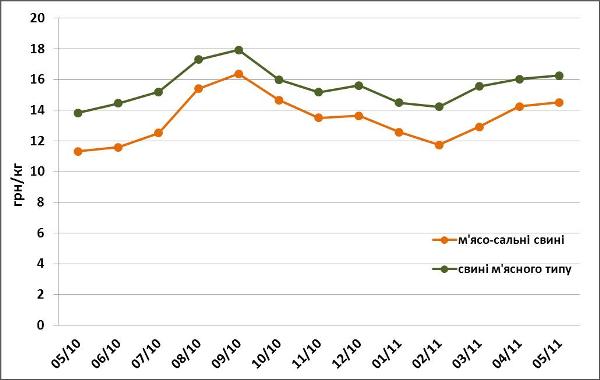 Спостерігаючи за динамікою закупівельних цін на свиней, помітна тенденція загального зростання від лютого поточного року, яке дещо пригальмувало у травні. Середньозважені ціни на свиней м’ясного типу у травні становили 16,25 грн/кг, а свині м'ясо-сального типу коштували 14,50 грн/кг.