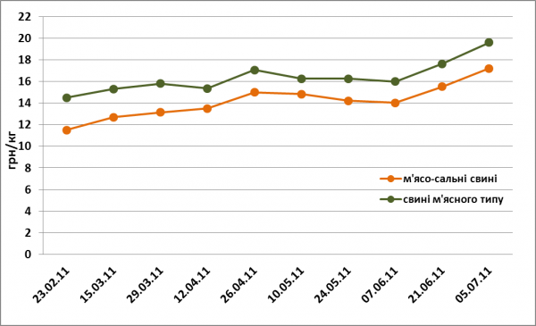 На початку липня поточного року ціни на забійних свиней продовжують зростати. Відчувається гостра нестача м’ясної сировини на внутрішньому ринку. Імпорт свинини все ще залишається обмеженим, а тому м'ясопереробні підприємства змушені продовжувати підвищувати планку закупівельних цін аби хоч якось поповнити запаси сировини. За період з 21 червня по 5 липня ціни на м'ясо-сальних свиней зросли майже на 11% (1,5 грн/кг) та становили 17 грн/кг. Свині м’ясного типу теж вагомо додали у ціні: за зазначений період вона підвищилась на 11,2% (2 грн/кг) і досягла позначки 19,5 грн/кг Варто зауважити, що наприкінці лютого за свиней м'ясного типу пропонували 14,5 грн/кг, тоді як сальні свині коштували 11,5 грн/кг.