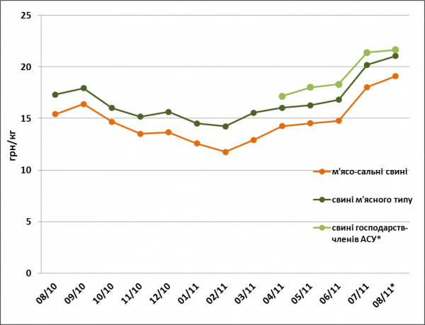 У серпні поточного року, у порівнянні з попереднім місяцем, закупівельні ціни на м’ясо-сальних свиней зросли ще на 5,8% (1,05 грн/кг) та досягли позначки 19,1 грн/кг. Свині м’ясного типу додали у ціні 4,3% (0,85 грн/кг). За таких тварин пропонували в середньому 21,05 грн/кг. Якщо ж порівняти серпневі ціни попереднього та поточного років, то за рік ціни на м’ясо-сальних свиней підвищились на 23,8% (3,65 грн/кг), а м’ясні свині подорожчали на 21,7% (3,75 грн/кг). Найвищими залишаються ціни на високоякісних свиней Асоціації свинарів України. За кілограм такої свинини пропонують 21,65 грн/кг, що на 1,3% (0,25 грн/кг) дорожче, ніж попереднього місяця.