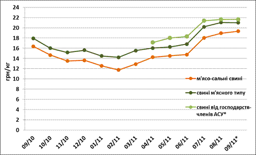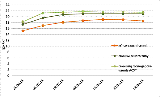 Цінові коливання, що тривали протягом року (вересень 2010 р. – вересень 2011 р.) (рис. 2), зупинились на вищому рівні, аніж рік тому. У порівнянні з вереснем 2010 р. ціни зросли на 18%. Так, закупівельні ціни як на м’ясо-сальних так і свиней свиней м’ясного типу піднялись на 3 грн/кг: з 16,40 до 19,35 грн/кг та з 18 до 21 грн/кг відповідно.
