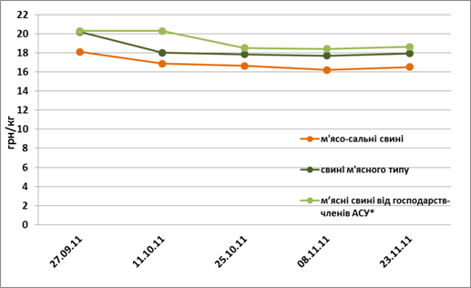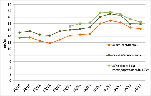 У листопаді поточного року зниження цін на свинину, що розпочалось ще у серпні, продовжилось. Хоча наприкінці місяця і розпочалось незначне зростання, середньомісячні ціни все одно знизились нижче жовтневого рівня. Так, за останній місяць осені середня ціна на свиней м’ясного типу знизилась на 0,6% (0,1 грн/кг) та встановилась на рівні 17,8 грн/кг. М’ясо-сальні свині подешевшали на 2,4% (0,4 грн/кг) та коштували 16,35 грн/кг. Середня ціна на свиней м’ясного типу від господарств-членів АСУ у листопаді знизилась на 4,5% (0,9 грн/кг) до 18,5 грн/кг.