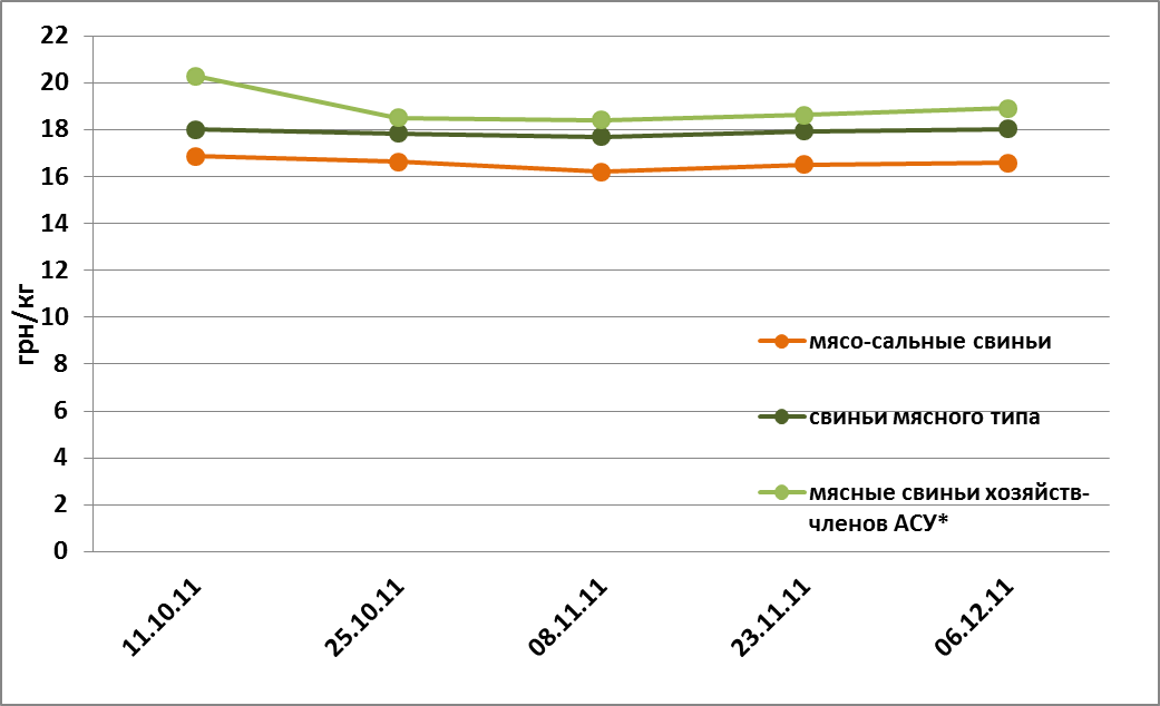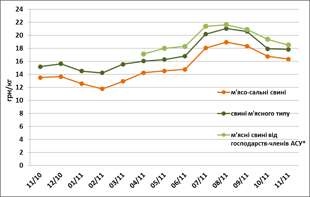 У листопаді поточного року зниження цін на свинину, що розпочалось ще у серпні, продовжилось. Хоча наприкінці місяця і розпочалось незначне зростання, середньомісячні ціни все одно знизились нижче жовтневого рівня. Так, за останній місяць осені середня ціна на свиней м’ясного типу знизилась на 0,6% (0,1 грн/кг) та встановилась на рівні 17,8 грн/кг. М’ясо-сальні свині подешевшали на 2,4% (0,4 грн/кг) та коштували 16,35 грн/кг. Середня ціна на свиней м’ясного типу від господарств-членів АСУ у листопаді знизилась на 4,5% (0,9 грн/кг) до 18,5 грн/кг.