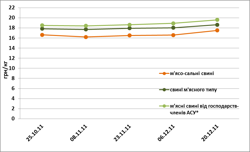 За період з 6 по 20 грудня цього року тривало зростання закупівельних цін на свиней усіх категорій. Зокрема, м’ясо-сальні свині подорожчали на 5,6% до 17,5 грн/кг. Свині м’ясного типу подорожчали на 3,2% і коштували 18,65 грн/кг. Найвищими були ціни на свиней від господарств АСУ. Такі свині подорожчали на 3,7% до 19,6%.
