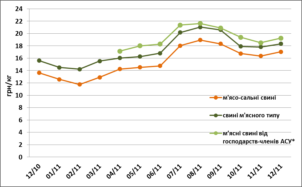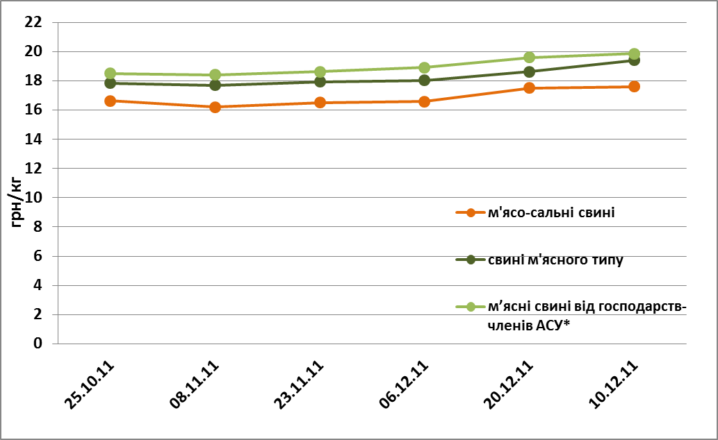 За період з 20 грудня 2011 р. по 10 січня 2012 р. закупівельні ціни на всі категорії свиней у живій вазі зросли. Зокрема, свині м'ясо-сального типу подорожчали на 0,6% (0,1 грн/кг) до 17,6 грн/кг. М’ясні свині додали у ціні 4% (0,7 грн/кг) та коштували 19,4 грн/кг. Найдорожчими залишаються свині від господарств Асоціації виробників свинини. За вказаний період ціна на таких свиней підвищилась на 1,3% (0,25 грн/кг) та дорівнювала 19,85 грн/кг.