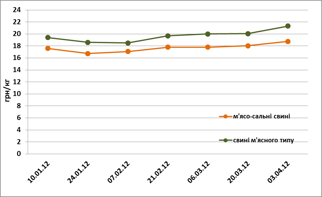 Рівень цін, що встановився у березні поточного року є значно вищим, ніж рівно рік тому. Так, порівняно із березнем 2011-го, м’ясо-сальні свині подорожчали на 38% (з 12,9 грн/кг), а свині м’ясного типу додали у ціні 29% (з 15,55 грн/кг).