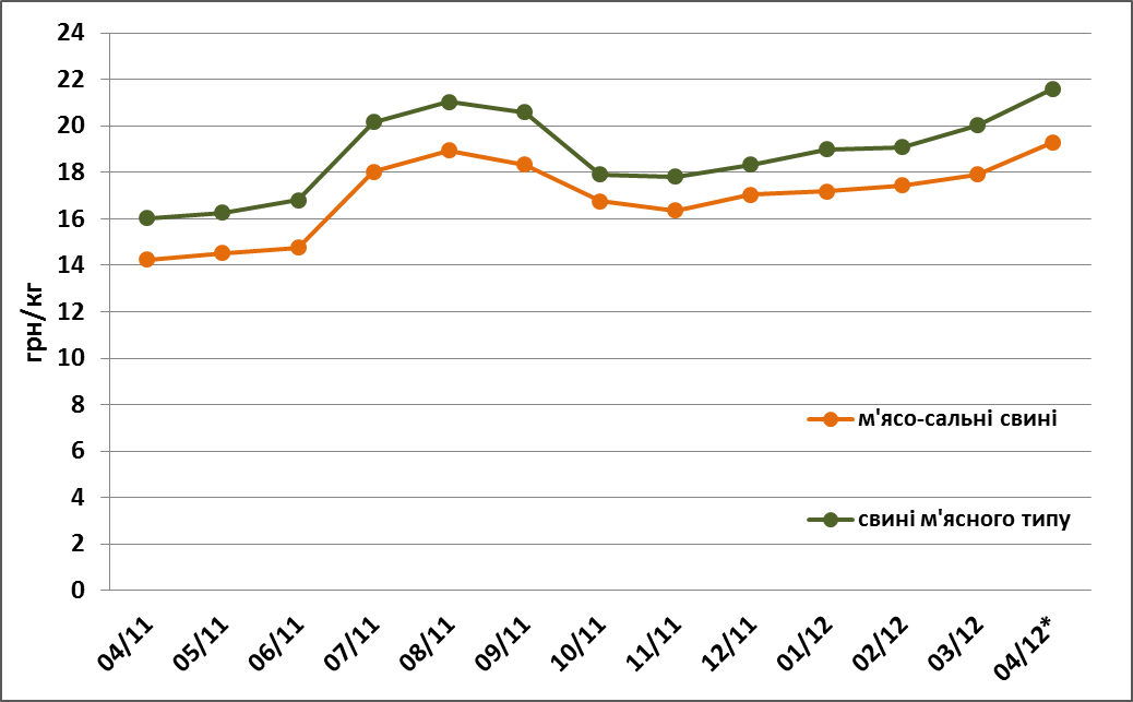Загалом, середня ціна на беконних свиней (І категорії) у квітні становить 21,6 грн за кілограм живої ваги, що на 8%, або 1,6 грн дорожче, ніж минулого місяця. Свині ІІ категорії (м'ясо-сальні) у квітні подорожчали ще на 7,7% (1,35 грн/кг) та коштували в середньому 19,3 грн/кг.