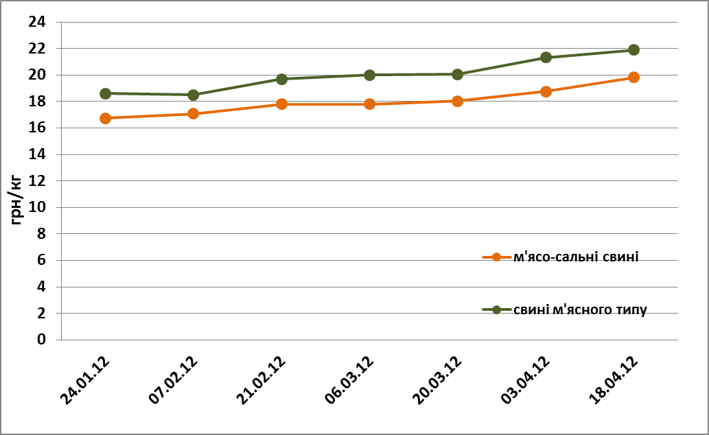Рис. 1. Динаміка цін на свиней у живій вазі, квітень 2011 р. – квітень 2012 р., грн/кг (за даними переробних підприємств)
