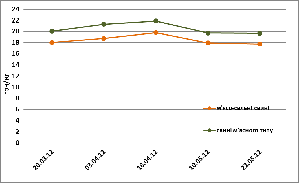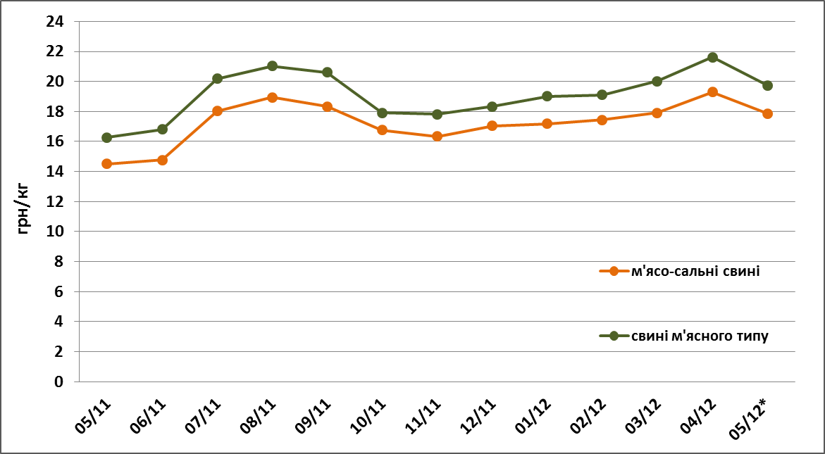 Рис. 1. Динаміка цін на свиней у живій вазі, травень 2011 р. – травень 2012 р., грн/кг (за даними переробних підприємств)