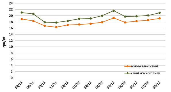 Рис. 1. Динаміка цін на свиней у живій вазі, серпень 2011 р. – серпень 2012 р., грн/кг (за даними переробних підприємств)