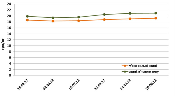 Загалом, станом на 29 серпня ціна на свиней м'ясного типу становила майже 21 грн/кг. За свиней м'ясо-сального типу пропонували 19,25 грн/кг.