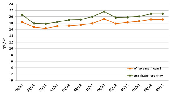 Середні ціни на забійних свиней у вересні залишились на майже сталому рівні відносно серпня. Очікувалось, що у вересні відбудеться помітне зниження ціни, але за рахунок зростання ціни на свиней у основних європейських країнах-експортерах, зросла вартість імпортної свинини. Це зробило даний продукт менш привабливим для переробників. Відповідно, зріс попит на вітчизняних свиней.