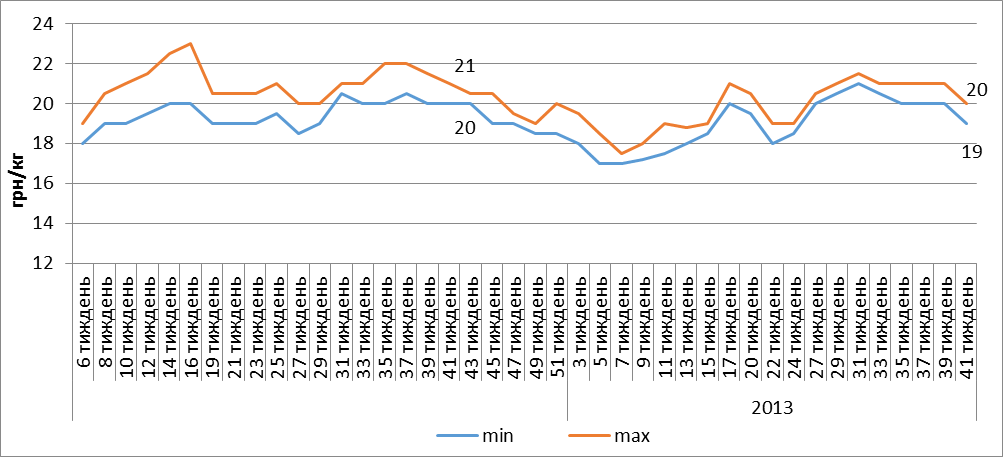 На початку 41 тижня, ціни на свиней І категорії коливались в межах 19−20 гривень за кілограм живої ваги (за аналогічний період минулого року діапазон цін перебував на рівні 20−21 грн/кг). Аналогічна ситуація зі свинями ІІ категорії — ціни знизились до 17−18 грн/кг, тоді як минулого року за тварин цієї категорії пропонували 19−20 грн/кг.