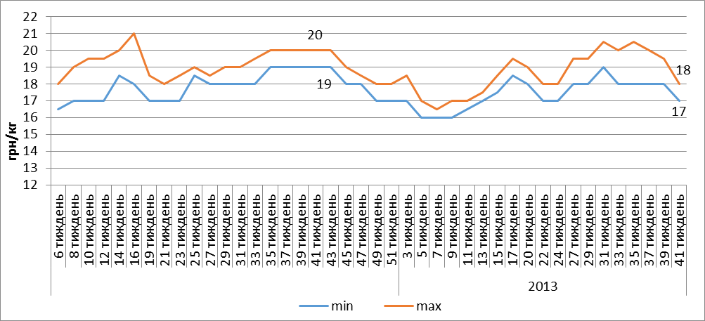 Рис. 1.Динаміка закупівельних цін на свиней у живій вазі (І категорія)