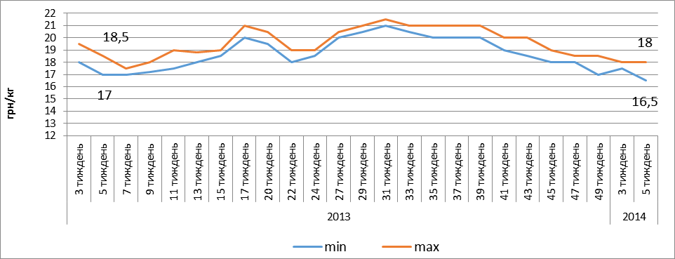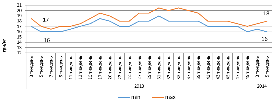 Станом на кінець січня 2014 року, за кілограм живої ваги свиней І-ї категорії пропонують від 16,5 до 18 гривень. Для порівняння, минулорічні ціни перебували в діапазоні 17,5-18,5 грн/кг. Щодо свиней ІІ-ї категорії, то на них ціна коливається в межах 16-17,5 грн/кг (минулорічний показник — 16-17 грн/кг).