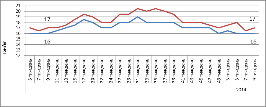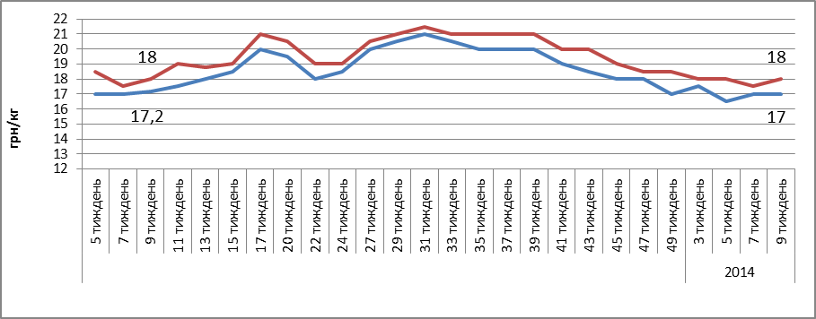 Рис. 1.Динаміка закупівельних цін на свиней у живій вазі (І категорія)