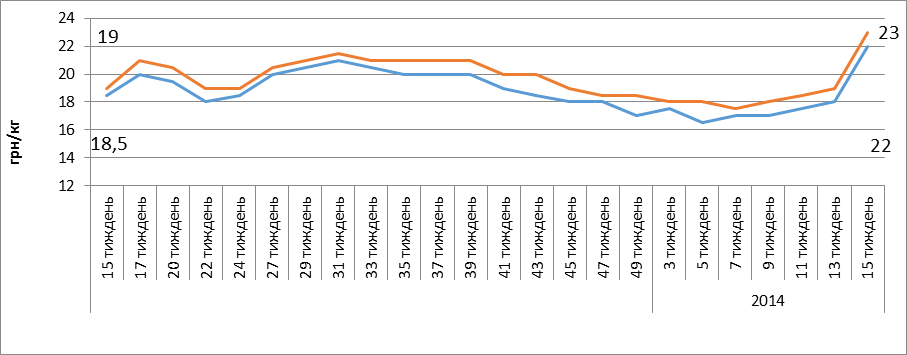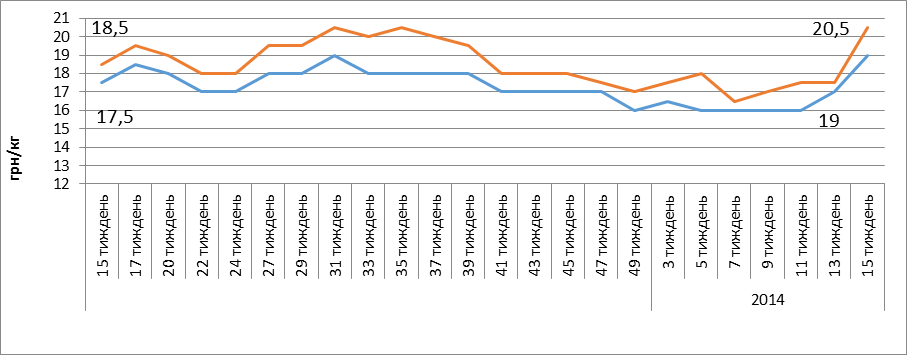 Скоріш за все, навіть такий рівень цін не є максимумом, тому найближчим часом можна очікувати на подальше їхнє зростання (у межах 1-1,5грн/кг). Така ситуація може протриматися до завершення травневих свят, після чого, ціни, ймовірно, повернуться до рівня 19-20 грн/кг для І-ї категорії та 17,5-18 для ІІ-ї.