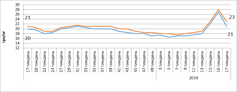 Якщо станом на 15-ий тиждень 2014 року спостерігалося більш, ніж істотне підвищення цін (15 % відносно 14-го тижня), то в останній тиждень перед Великоднем сталося небачене раніше – ціни на свинину І-ї категорії злетіли до рівня 27-28 грн/кг. Таким чином, було встановлено абсолютний рекорд цін на свинину за весь період незалежності України.