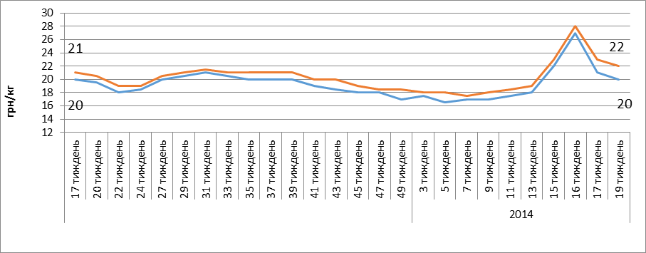 Станом на 19-ий тиждень 2014 року, за кілограм живої ваги свиней І-ї категорії пропонують від 20 до 22 гривень, ціни на свиней ІІ-ї категорії коливаються у межах 18-20 грн/кг. Низхідний ціновий тренд підтверджує наші попередні прогнози, хоча й була надія, що «просідання» ціни мало бути трішки меншим.