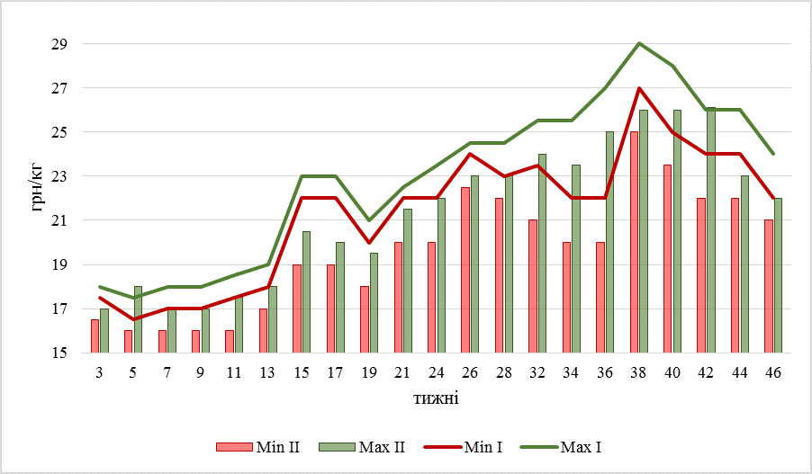 У другій декаді листопада ціна на живець свиней м’ясного типу варіюється від 22 до 24 грн/кг, тож з кінця жовтня діапазон знизився на дві гривні. Трохи менше − на гривню − змістилися межі коливання цін другої категорії: таких свиней закупають по 21-22 гривні за кілограм живою вагою, дорожче − лише у Західних областях.