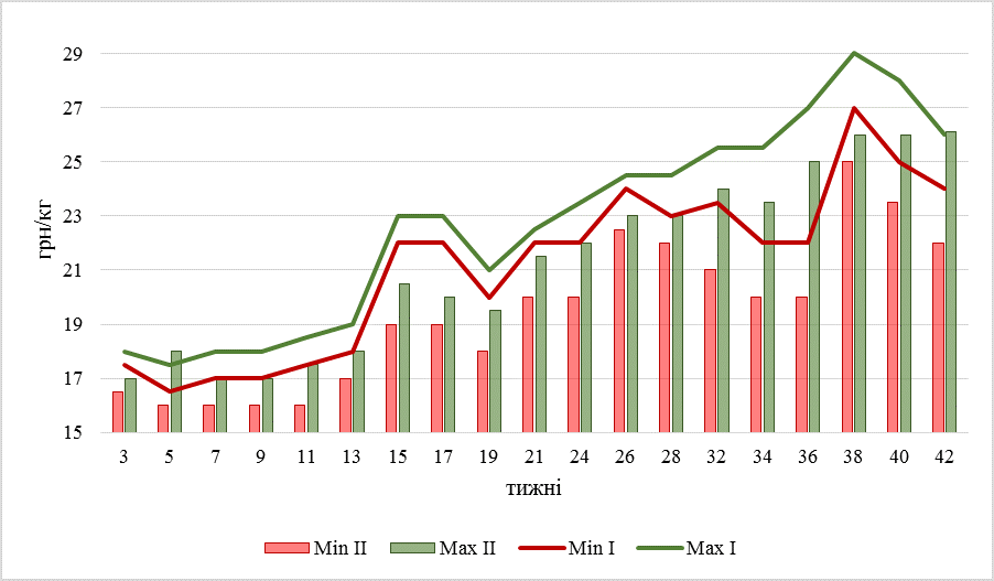 Динаміка цін на свиней у живій вазі (42 тиждень)