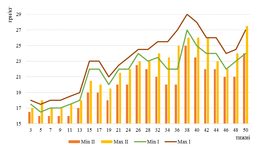 Цінові діапазон на свиней першої та другої категорії на п’ятдесятому тижні майже зрівнялися. М’ясних свиней закупають в середньому по 26 гривень за кілограм і дорожче, то подекуди лунають і суттєво нижчі ціни ― 24-24,5 грн/кг. Закупівельна ціна на другу категорію свиней варіюється від 24 до 27,5 гривень за кілограм.
