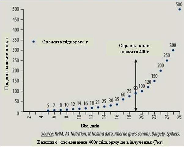 4). Сучасні підкорми діареї не спричиняють. Якщо у поросят проноси, шукайте інші причини. Рис. 1 демонструє переваги раннього застосування підкорму, проте рівень споживання твердого корму не можна заміряти одразу. Природно, поросята-сисуни надають превагу материнському молоку, тому дайте час розвинутися їхній цікавості, що змусить їх копіювати трішки сміливіших братиків і сестричок, які вже почали пробувати прикорм на зуб. Переконайтеся, що сисуни споживають до моменту відлучення не менше 400 г прикорму. Експерти переконані, що для сучасного прикорму цього достатньо, аби підготувати внутрішній шар кишківника до споживання «дорослого» корму та раптового зникнення із раціону маминого молока так, аби уникнути «кормового шоку». Ось чому традиційним терміном відлучення поросят є вік 28 днів — саме у цей період поросята справді здатні спожити 400 г прикорму (Рис. 2).