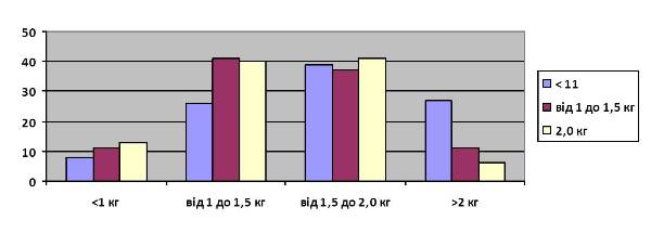 Графік 2. Вплив кількості поросят у гнізді на відсоток свиней, які народилися в різних вагових категоріях