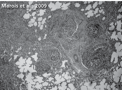 діагностування інфекціїM. hyo на рівні стада, хоча він малоінформативний нарівні однієї тварини. Для того, щоб в організмі свинейсформувалися антитіла до цього патогену, повинніпройти тижні, а то й місяці. До того ж імунна відповідь кожної тварини індивідуальна. Тому результати ІФА-тесту використовуються лікарями та експертами для визначення концентрації інфекції в стаді та моменту інфікування тварин. Гістологічне дослідження тканин легень. Цей метод протилежний серологічному і проводиться на рівні однієї тварини (кількох тварин). Його використовують для визначення характеру та ступеню ураження тканин, а також для дифференціального діагнозу при інфікуванні одночасно кількома патогенами. Щоб встановити діагноз, необхідно дослідити уражені тканини під мікроскопом.