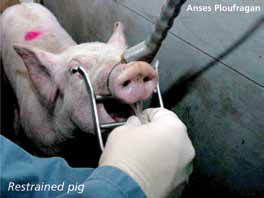 - ПЛР (Полімеразна ланцюгова реакція) або, простими словами, копіювання ДНК. Завдяки цьому тесту можна визначити, чи ДНК патогена присутня у пробі, взятій у свині. Процедура нескладна. Тварину фіксують, завдяки рото розширювачу тримають її пащу відкритою, вводять ендотрахеальну трубку і беруть пробу. Також завдяки ПЛР досліджують рідину з легень забитих тварин. Єдиний недолік ПЛР — тест «не бачить» різниці між інфікуванням і хронічною інфекцією.