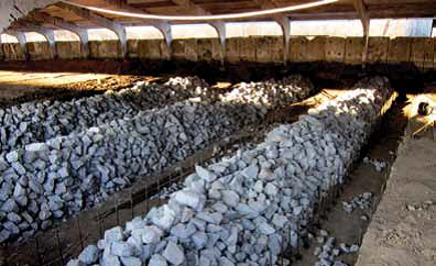 Розміри каміння для подушок геотермічної системи вентиляції мають бути в межах 50–150 мм. Дрібний відсів хоч і збільшує ефект охолодження, але, разом із тим, спричиняє розрідження повітря. В Україні для кам’яних подушок використовують граніт, адже він має високі теплообмінні якості. Щоб позбутися дрібних крихт, рекомендують закладати у канали тільки помите каміння.