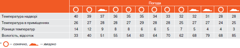 Таблиця 1. Ефективність охолодження за допомогою водяних панелей залежно від вологості повітря