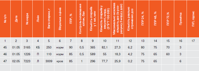 Таблиця 1. Мінімальні показники якості сперми впродовж доби після забору еякуляту (Kevin J. Evaluating Boar Semen Quality. Animal Science Facts)