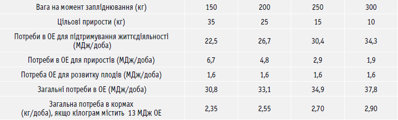 З таблиці 1 видно, що від моменту запліднювання до опоросу потреби свиноматок в ОЕ зростають приблизно на 7 МДж/доба. Найбільше енергії тварини витрачають на підтримку життєдіяльності, проте цей показник, як уже зазначалося, буде змінюватися залежно від умов утримання і статусу здоров’я стада.