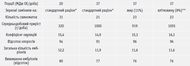 Таблиця 2. Відсоток запліднюваності первісток і виживаності ембріонів на 35-ий день поросності залежно від добового споживання корму та його складу (Athorn et al., 2012).