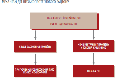 Низькопротеїнові раціони позитивно впливають на здоров’я свиней, оскільки мають підкислюючу дію, що перешкоджає розмноженню патогенів у шлунковокишковому тракті. Це ефективний спосіб попередження діареї.