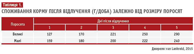 Упродовж перших діб після відлучення великі поросята споживають менше корму, ніж маленькі (оскільки мають більші запаси енергії). Однак після кількаденної адаптації вони починають «надолужувати» втрачене. Це може бути причиною загибелі найкращих поросят у загоні: компенсаторний ріст може стати причиною розвитку набрякової хвороби.