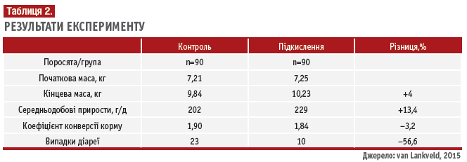 Австрійські дослідники провели експеримент, щоб визначити, як підвищення кислотності корму вплине на розлади травлення (діареї). Групі відлученців упродовж 13 діб згодовували звичайний (контрольна група) та підкислений корм (5 кг підкислювача — комбінація мурашиної, пропіонової кислот та їх солей — на тонну корму). У тварин дослідної групи покращилася конверсія корму, зросли середньодобові прирости, при цьому випадки діареї скоротилися більше, ніж уполовину.
